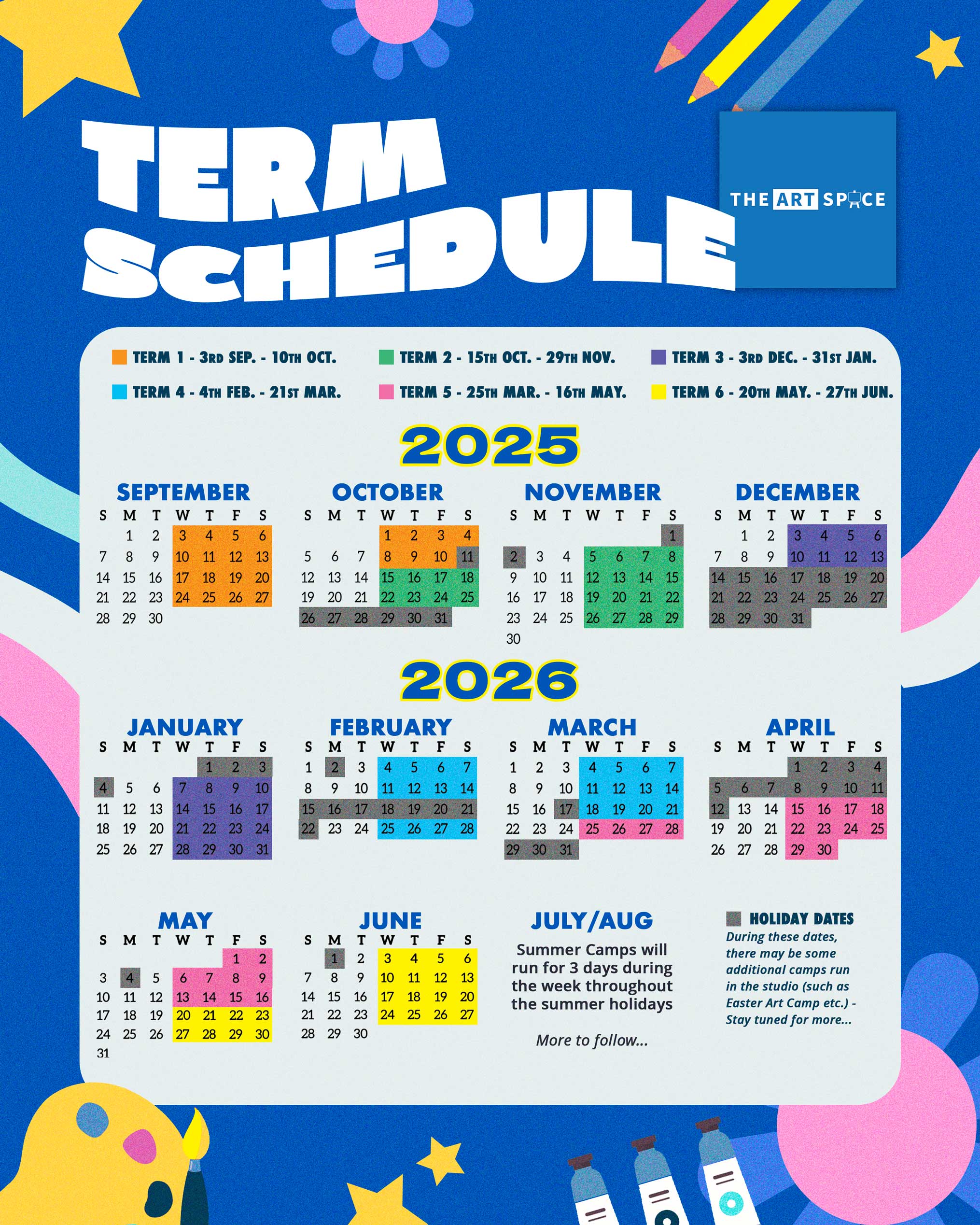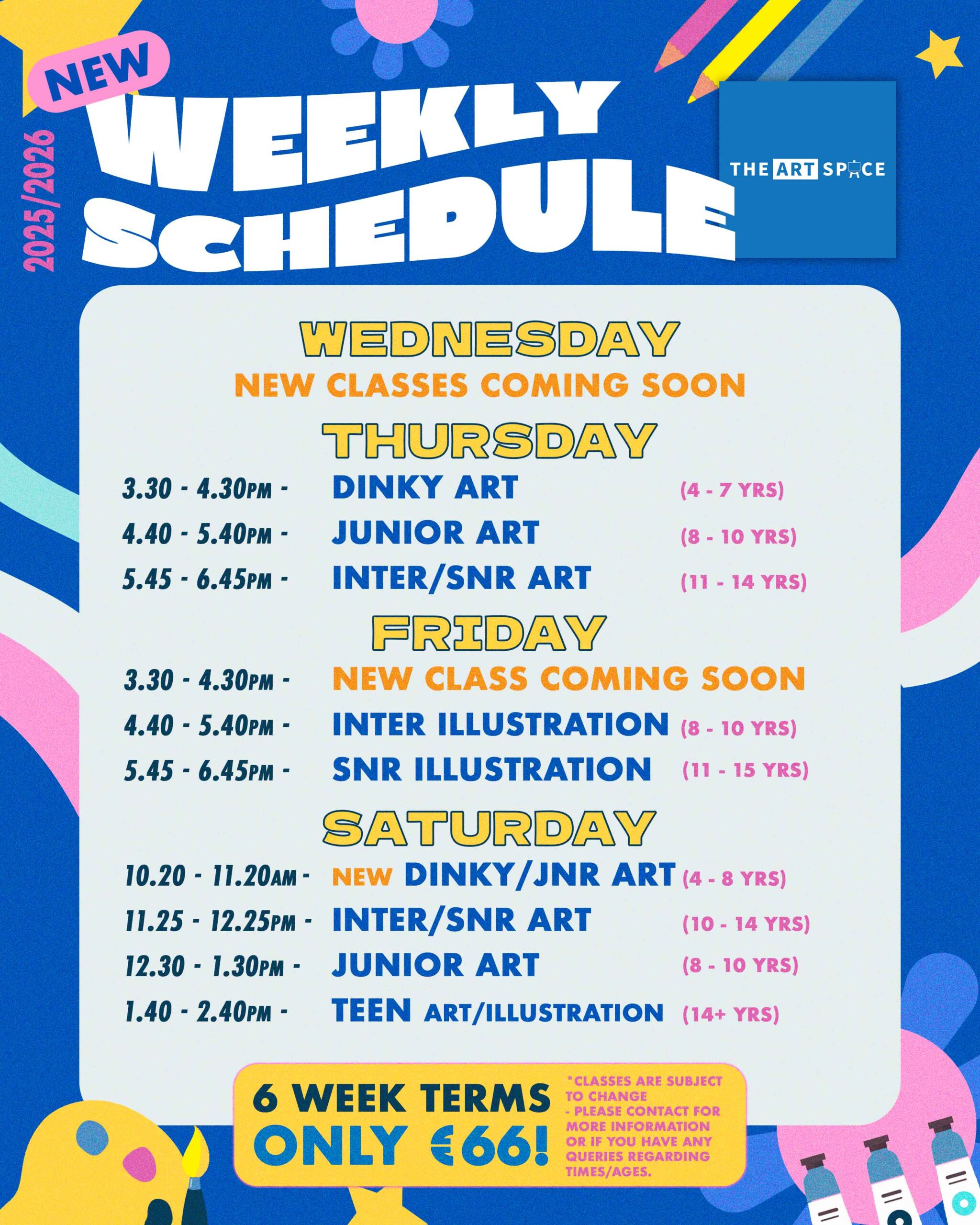 A Term in The Art Space will be 6 weeks. And for a 6 week term, the fee will be €66 for a Children's Art Class (*some classes may differ in price)